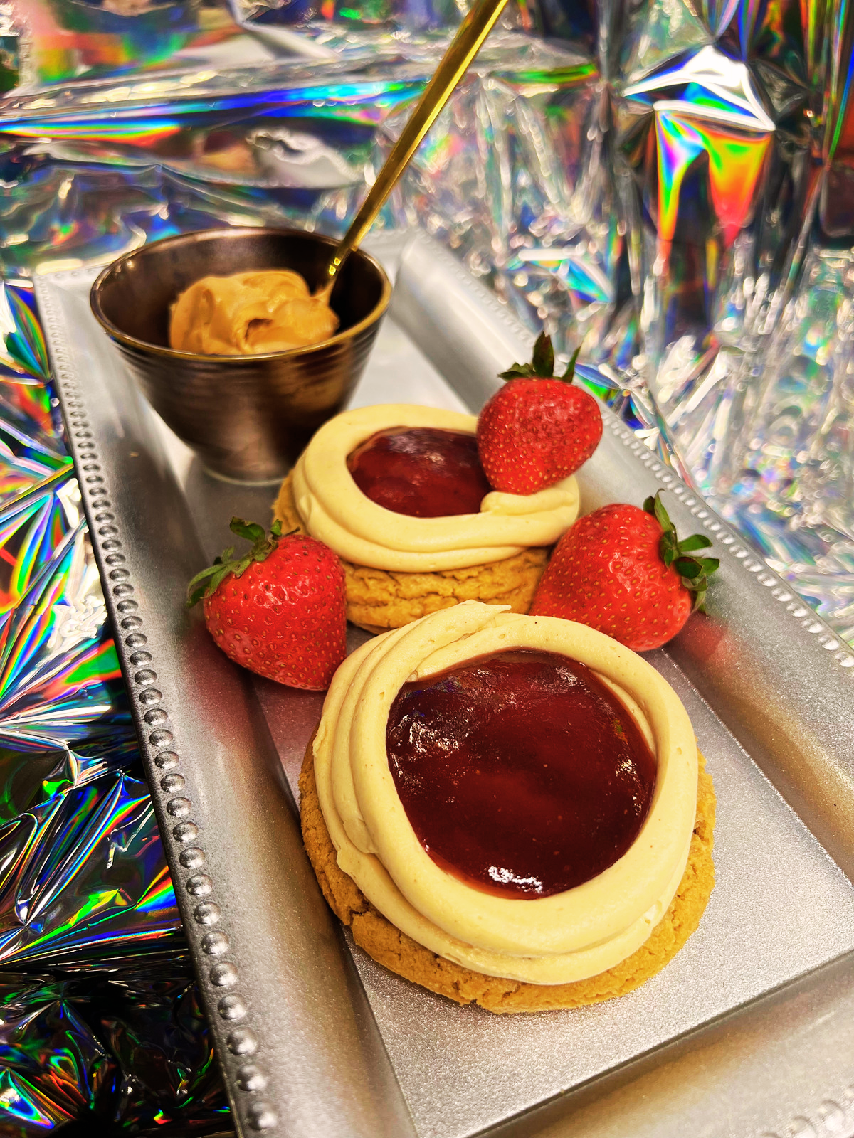 Peanut butter cookie filled with strawberry jam and topped with peanut butter buttercream.