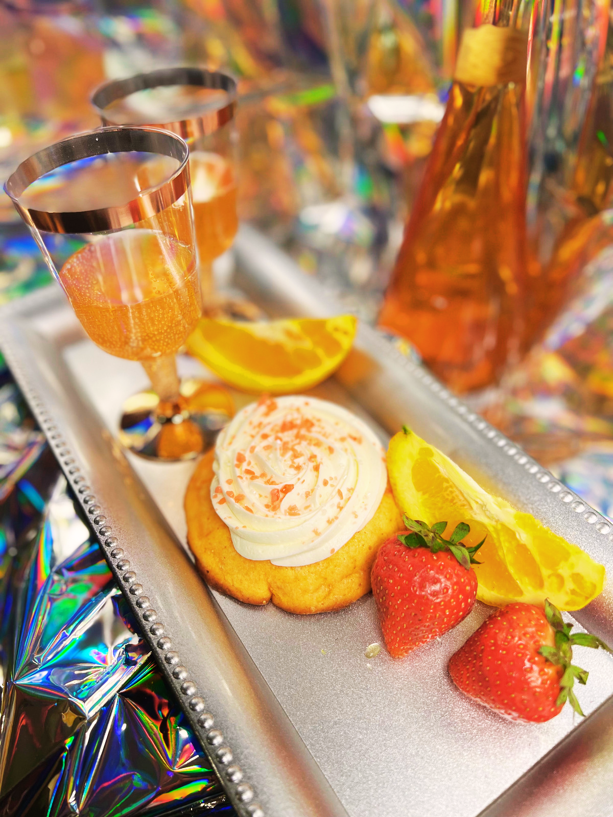 Orange cookie topped with champagne buttercream sprinkled with candy pearls and sparkles.